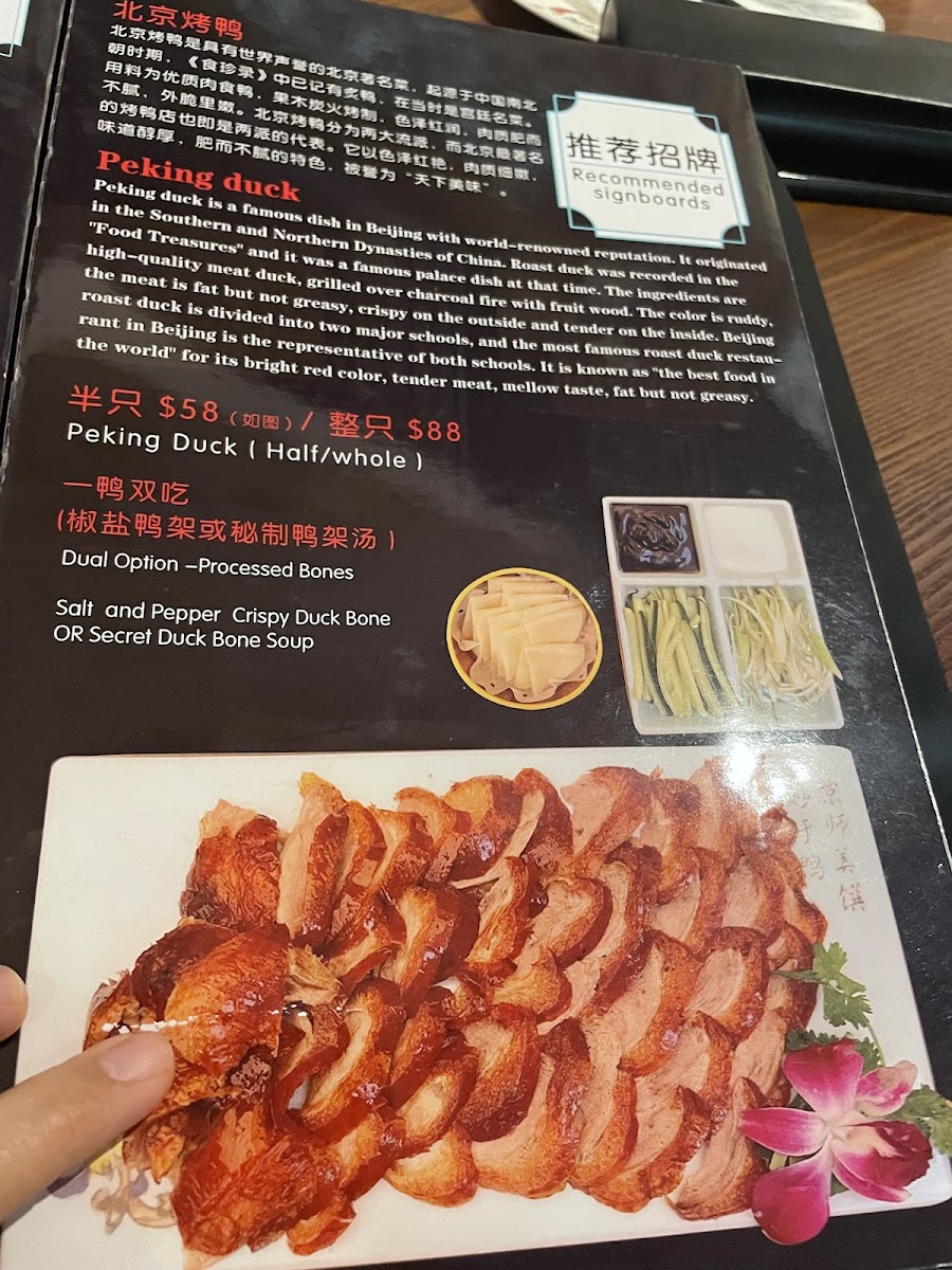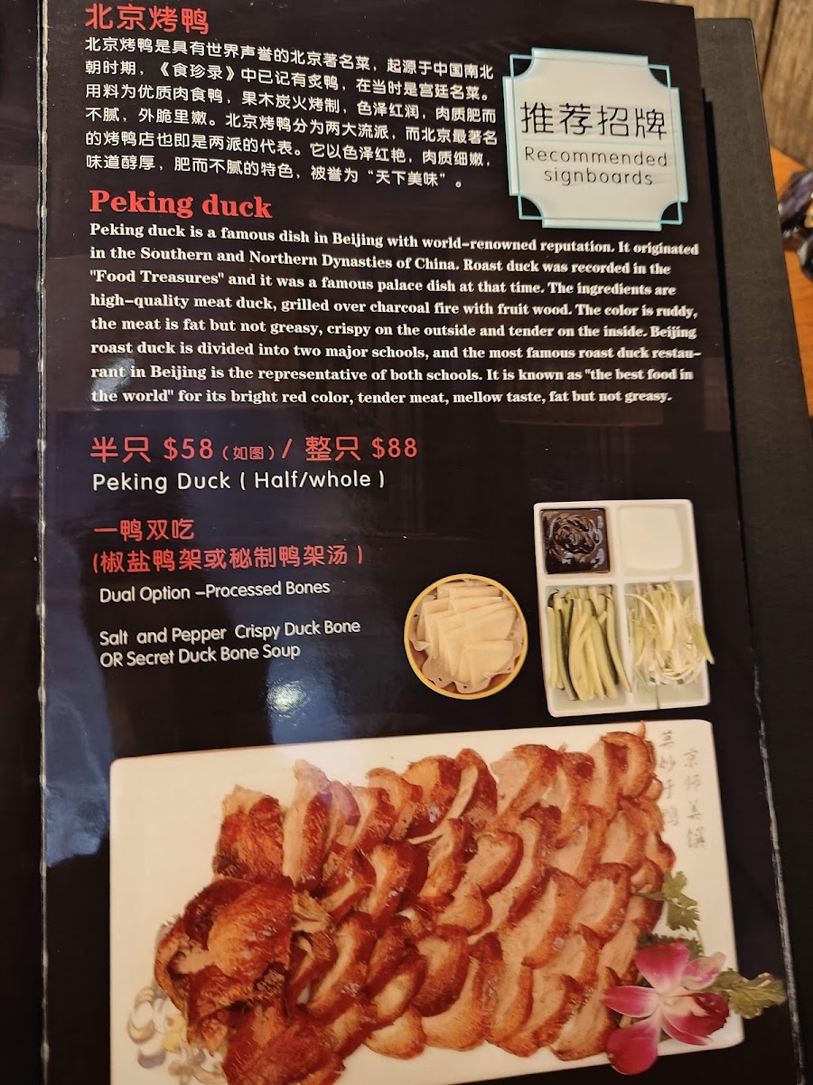 Guests can explore shareable plates like Basket Chicken and Steamed Dumplings, or enjoy hearty specialties such as Peking Duck and Sichuan Style Ribeye, each dish reflecting a deep respect for traditional techniques with a contemporary touch. Light soups like Egg with Tomato or Kelp with Spare Ribs provide a soothing complement to spicier options like Hot & Spicy Pork Kidney or Spicy Cauliflower in Hunan Style.
